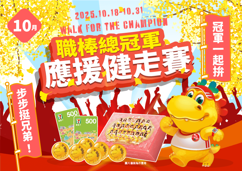應援中信兄弟衝擊第11座總冠軍,特別推出【TeamWalk 應援健走賽】!透過走路這個最簡單、最有力量的行動,號召全民一起為中信兄弟加油!本活動結合棒球熱情與健走精神,鼓勵大家下載並使用 TeamWalk APP,不僅能養成健康生活習慣,還能參加抽獎、贏得龍珠與啦啦隊女孩卡等超值好禮!