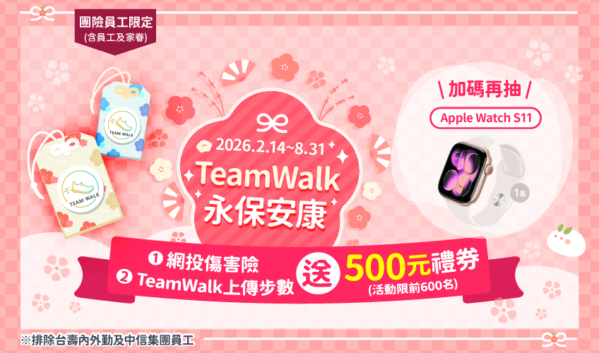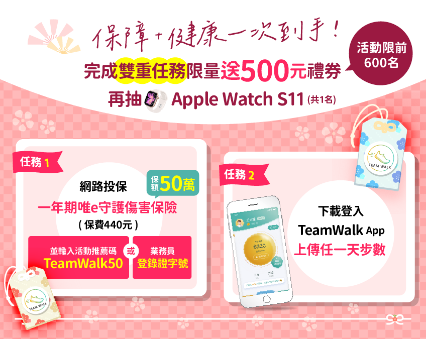 網路投保【唯e守護】一年期50萬保額傷害險 (保費約440元)且登入TeamWalk上傳任一天步數,前600名贈500元禮券,活動期間可抽Apple Watch S11 (共1名),申請電子保單再加碼5次抽獎機會,TeamWalk讓你的每一步都有保障!
