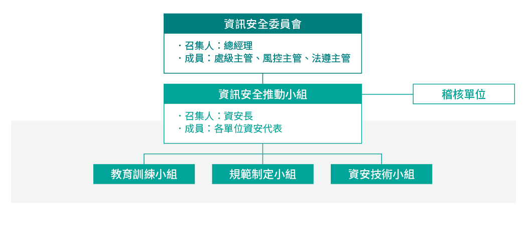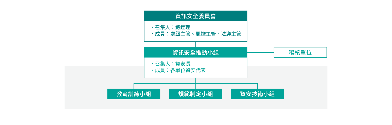 已制定由董事會核定之「資訊安全政策」,設立「資訊安全管理會議」,由總經理擔任召集人,總經理轄下一級主管及風控長、法遵長為會議委員,邀請稽核主管列席,並設置直隸於總經理之資訊安全長,負責管理獨立運作之資訊安全部,綜理資安治理、資安系統維運及資安事件應變等業務,每月亦將高風險資安事故情境之關鍵風險指標納入風險管理單位之風險整合報告書向董事會報告、每年向董事會提報整體執行情形、每半年於資訊安全管理會議中呈報推動成效。
