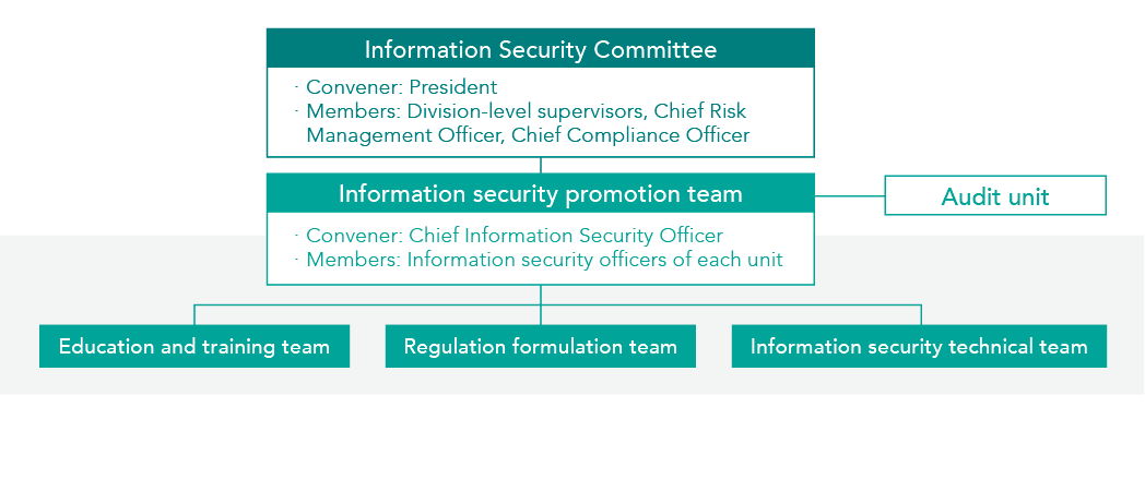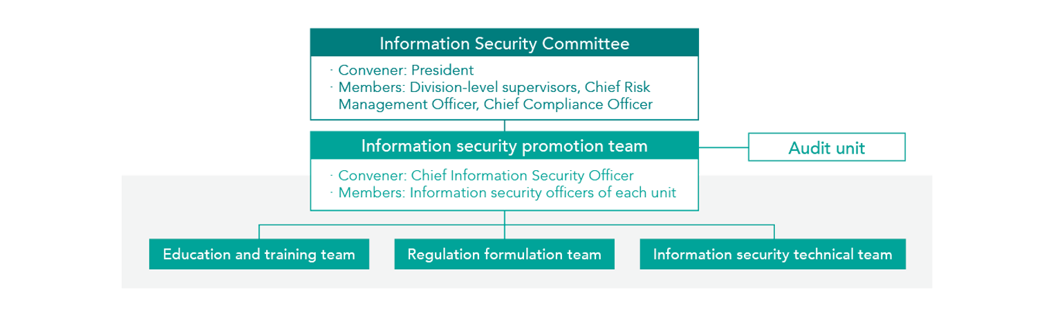 The Company has established an Information Security Policy approved by the Board of Directors and set up an Information Security Committee chaired by the President. Committee members include top-level executives under the President, Chief Risk Management Officer, and Chief Compliance Officer, with the audit supervisor attending as a non-voting participant. A Chief Information Security Officer, reporting directly to the President, has been appointed to manage the independently operating Information Security Department, overseeing governance, system maintenance, and incident response. High-risk information security incident scenarios and key risk indicators are included in the monthly Risk Integration Report submitted by the Risk Management Department to the Board of Directors. The overall implementation status is reported to the Board annually, while implementation effectiveness is presented to the Information Security Committee semi-annually.