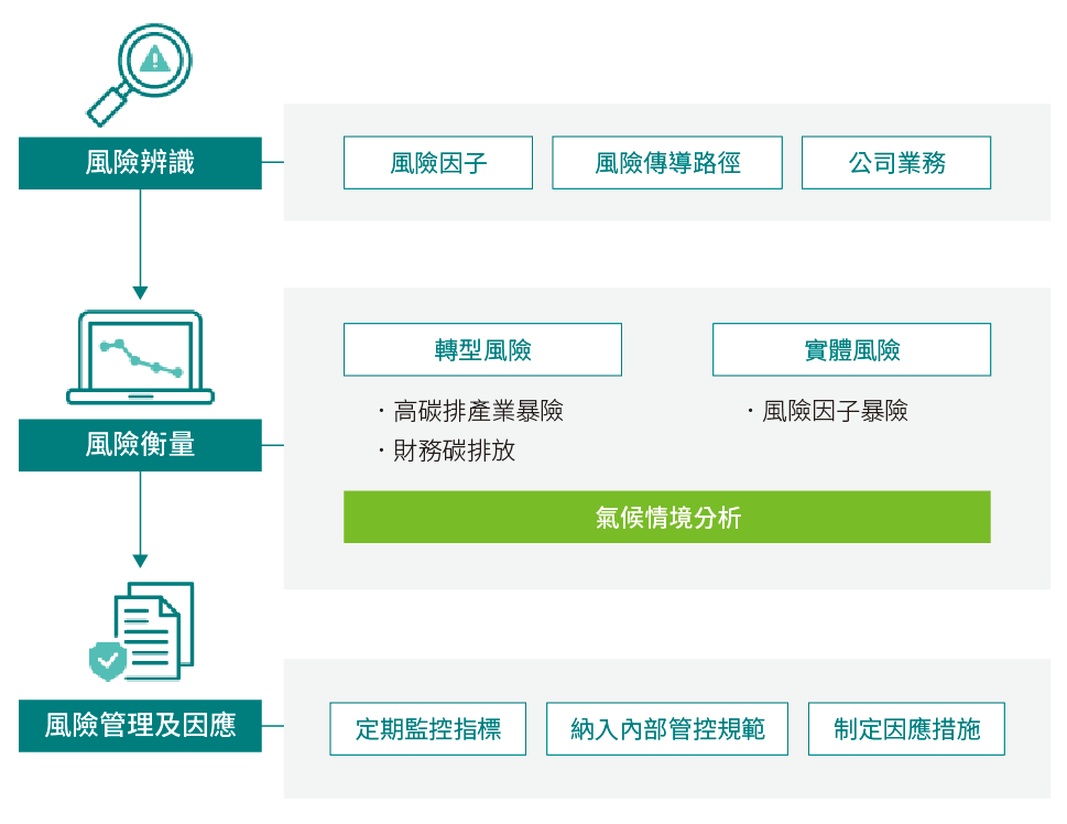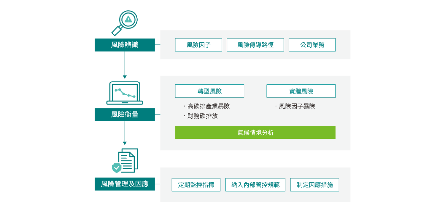 本公司於 2020 年經董事會通過並正式發布永續保險政策,規範保險營運應納入ESG(含氣候變遷風險與機會)議題;2021年依據「保險業風險管理實務守則」及承接「中信金控風險治理核心政策」,增訂氣候變遷風險管理原則於「台灣人壽風險治理核心政策」、「金融交易信用風險管理政策」、「作業風險管理政策」及「放款信用風險管理政策」,作為本公司及各子公司整體業務風險管理及執行遵守之依據,並修訂「責任投資政策」及「責任投資作業辦法」,並落實風險辨識、衡量及監控等機制。
