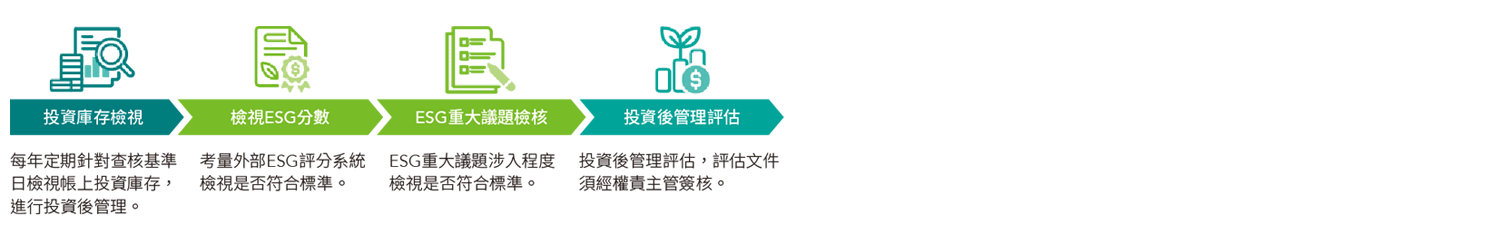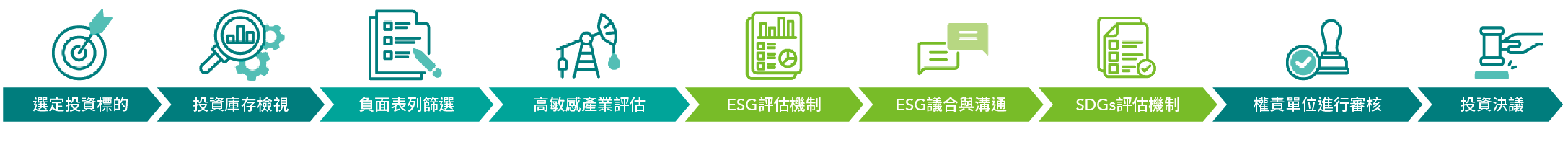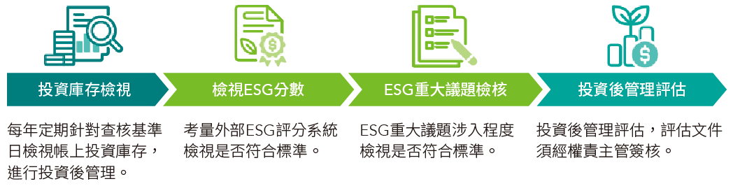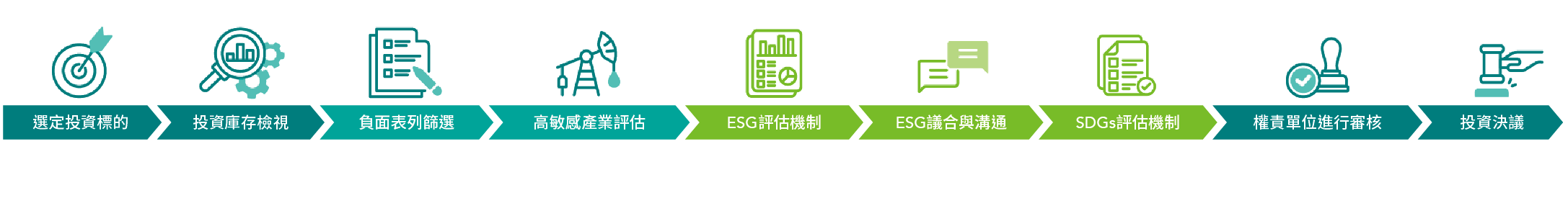 依循責任投資原則(PRI)之六大精神,台灣人壽制定「責任投資政策」及「責任投資作業辦法」,且於2021年增設永續投融資專責團隊,負責永續投資策略/政策制定與流程優化、積極參與內外部教育訓練與論壇活動並於每月定期檢視永續投融資的情形。