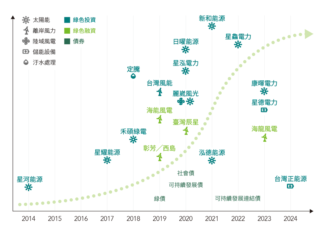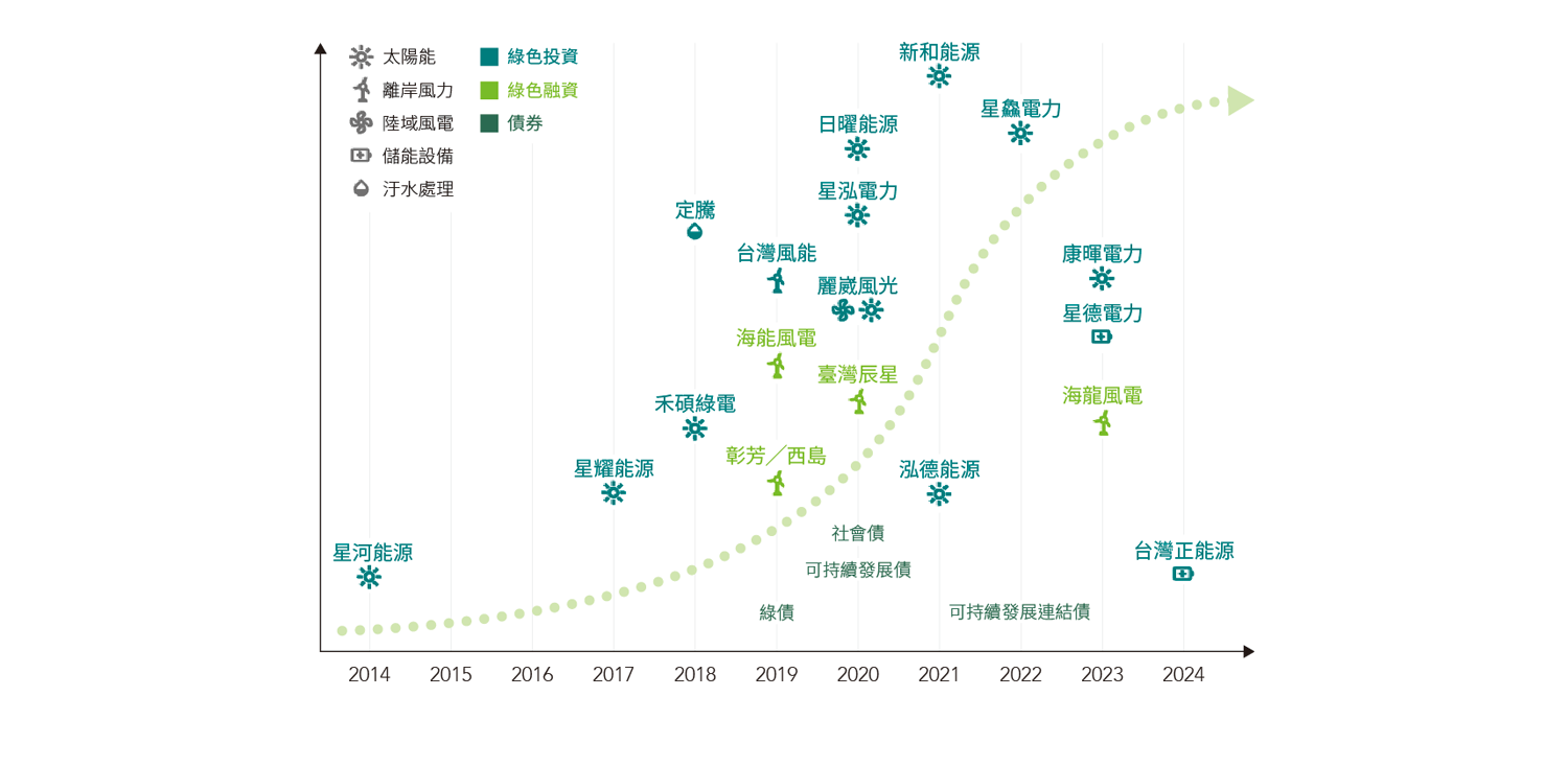 除此之外,台灣人壽積極響應政府的綠色能源政策及臺灣2050淨零排放路徑所列十二項關鍵戰略中的風電╱光電產業及電力系統與儲能產業,截至2024年底,台灣人壽已於六大核心戰略產業中綠電及再生能源產業(包含十二項關鍵戰略中的風電/光電產業及電力系統與儲能產業)投入累計182.14億元,並持續尋找與評估相關投融資項目。更進一步,我們亦盤點融資項目適用/符合「永續經濟活動認定參考指引」之情形,目前融資部位符合該指引前瞻經濟活動之放款占總法人放款之比例約為41.97%,除掌握投融資對象淨零轉型相關資訊,並了解透過乾淨能源對氣候變遷的影響。