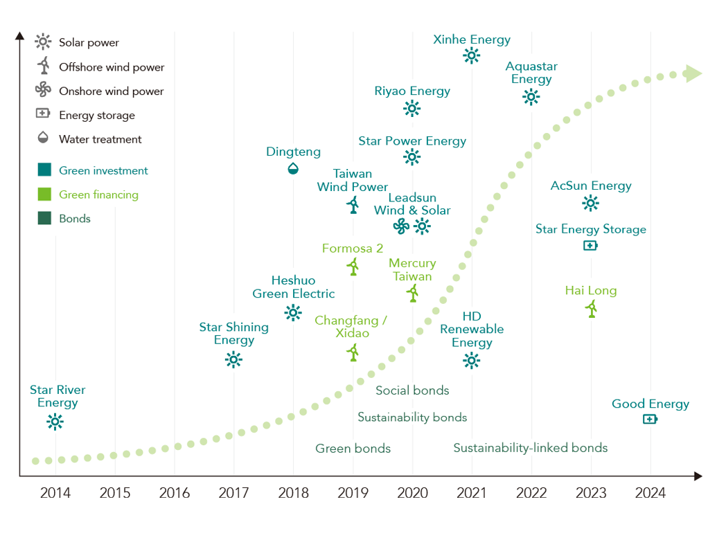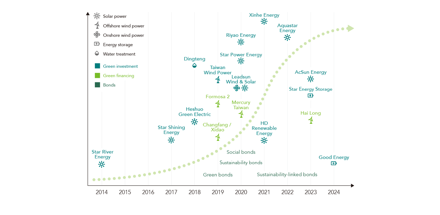 In terms of sustainable-themed investments, Taiwan Life aligns its asset allocation with its overall investment portfolio, primarily focusing on domestic and foreign bonds as well as project financing. As of 2024, the cumulative approved investment and lending amount in sustainable development sectors has reached NT$71.155 billion.