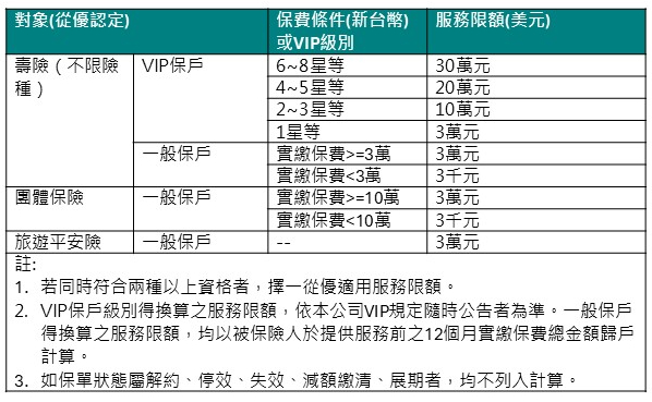 【適用對象】本公司個人壽險(不限險種)主契約、團體保險或旅遊平安險等有效保單之被保險人,可享有本公司「海外急難救助服務」。