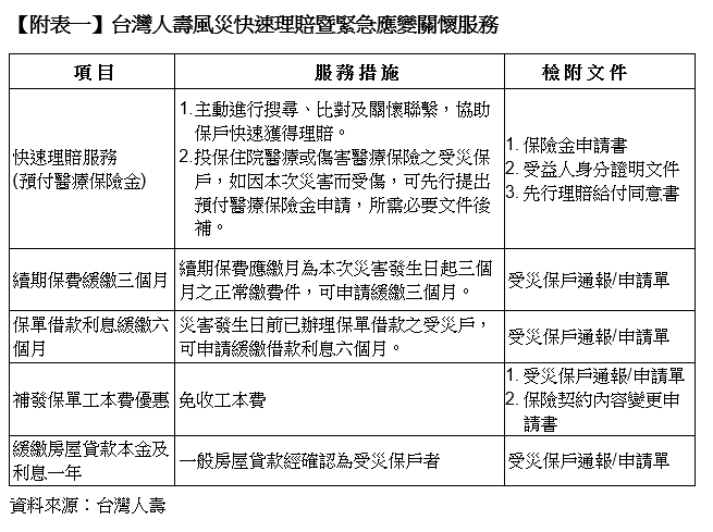 颱風期間服務不打烊,台灣人壽第一線客服人員維持正常服務,亦密切關注颱風動態,加強各地服務通報機制,主動查詢比對受災保戶及關懷聯繫,若颱風災害符合保單理賠條件之傷亡保戶,即啟動快速理賠服務及預付醫療保險金,所需文件後補即可。