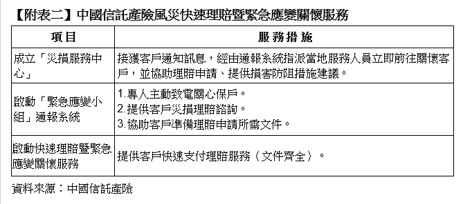 鳳凰颱風威力不容小覷,台灣人壽啟動受災保戶「快速理賠服務及預付醫療保險金」、「續期保費緩繳三個月」、「保單借款利息緩繳六個月」、「補發保單工本費優惠」及「緩繳房屋貸款本金及利息一年」等服務(詳如附表一);中國信託產險則成立「災損服務中心」,啟動快速理賠暨緊急應變關懷服務(詳如附表二)。