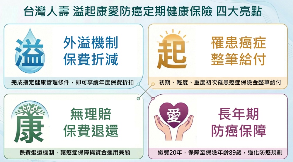 <註>「台灣人壽溢起康愛防癌定期健康保險」詳細商品內容及應注意事項,請詳本公司官網。