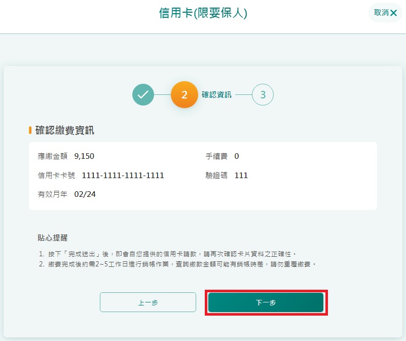 限使用要保人本人之VISA、MasterCard、JCB信用卡。